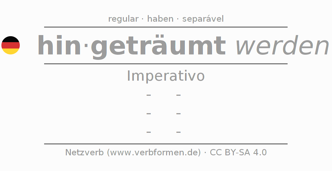 A conjugação do verbo hinträumen no Voz Passiva Imperativo Presente Imperativo é: -, -, -, -.A formação dessas formas segue determinadas regras gramaticais. Os requisitos para a conjugação do verbo como forma verbal simples no hinträumen do Imperativo. Comentários ☆