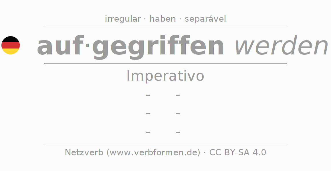 A conjugação do verbo aufgreifen no Voz Passiva Imperativo Presente Imperativo é: -, -, -, -.A formação dessas formas segue determinadas regras gramaticais. Os requisitos para a conjugação do verbo como forma verbal simples no aufgreifen do Imperativo. Comentários ☆