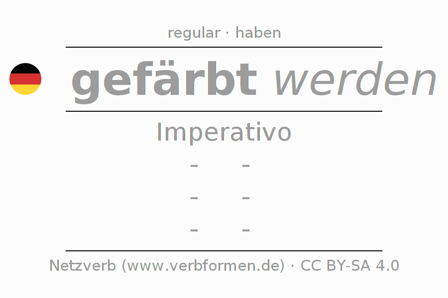 A conjugação do verbo färben no Voz Passiva Imperativo Presente Imperativo é: -, -, -, -.A formação dessas formas segue determinadas regras gramaticais. Os requisitos para a conjugação do verbo como forma verbal simples no färben do Imperativo. Comentários ☆
