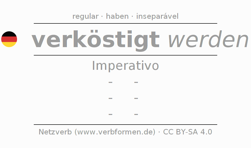 A conjugação do verbo verköstigen no Voz Passiva Imperativo Presente Imperativo é: -, -, -, -.A formação dessas formas segue determinadas regras gramaticais. Os requisitos para a conjugação do verbo como forma verbal simples no verköstigen do Imperativo. Comentários ☆