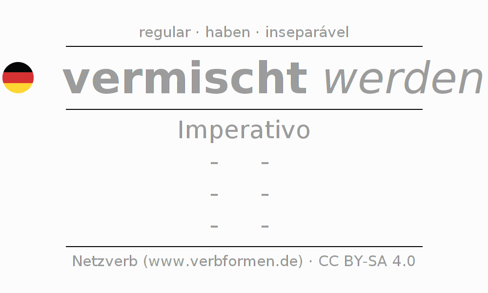 A conjugação do verbo vermischen no Voz Passiva Imperativo Presente Imperativo é: -, -, -, -.A formação dessas formas segue determinadas regras gramaticais. Os requisitos para a conjugação do verbo como forma verbal simples no vermischen do Imperativo. Comentários ☆