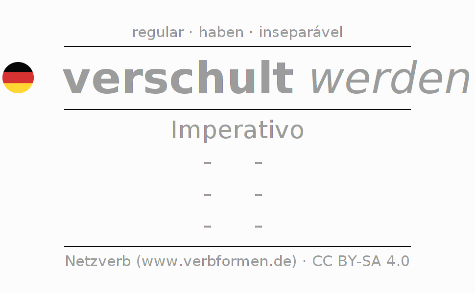 A conjugação do verbo verschulen no Voz Passiva Imperativo Presente Imperativo é: -, -, -, -.A formação dessas formas segue determinadas regras gramaticais. Os requisitos para a conjugação do verbo como forma verbal simples no verschulen do Imperativo. Comentários ☆