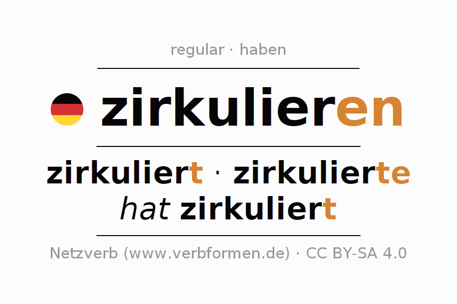 As formas de conjugação do verbo zirkulieren (circular, circularidade) no imperativo são: zirkuliere (du), zirkulieren wir, zirkuliert (ihr), zirkulieren Sie
