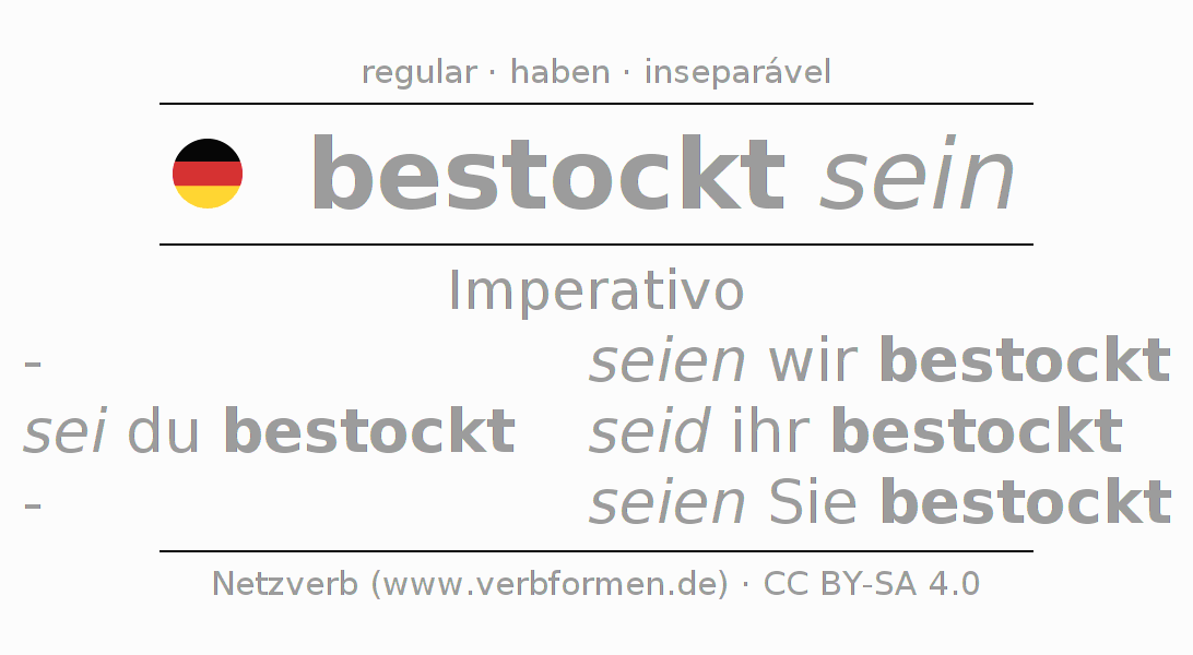 A conjugação do verbo bestocken no Estado passivo Imperativo Presente Imperativo é: sei (du) bestockt, seien wir bestockt, seid (ihr) bestockt, seien Sie bestockt.A formação dessas formas segue determinadas regras gramaticais. Os requisitos para a conjugação do verbo como forma verbal simples no bestocken do Imperativo. Comentários ☆