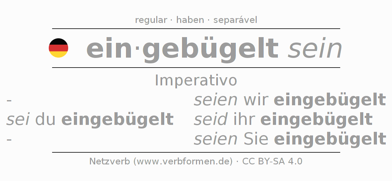 A conjugação do verbo einbügeln no Estado passivo Imperativo Presente Imperativo é: sei (du) eingebügelt, seien wir eingebügelt, seid (ihr) eingebügelt, seien Sie eingebügelt.A formação dessas formas segue determinadas regras gramaticais. Os requisitos para a conjugação do verbo como forma verbal simples no einbügeln do Imperativo. Comentários ☆