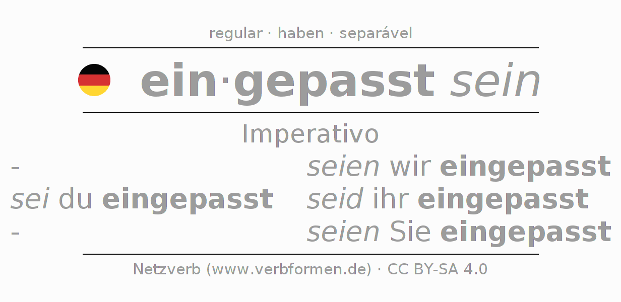A conjugação do verbo einpassen no Estado passivo Imperativo Presente Imperativo é: sei (du) eingepasst, seien wir eingepasst, seid (ihr) eingepasst, seien Sie eingepasst.A formação dessas formas segue determinadas regras gramaticais. Os requisitos para a conjugação do verbo como forma verbal simples no einpassen do Imperativo. Comentários ☆