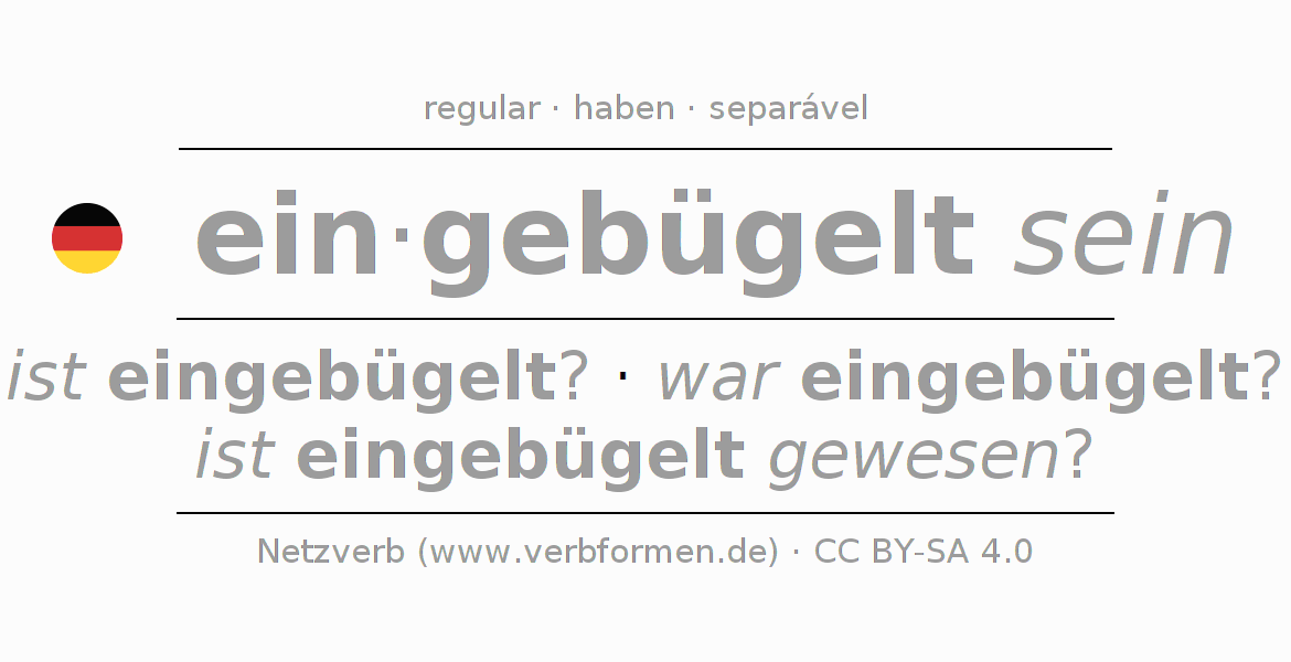 A conjugação do verbo einbügeln no Estado passivo Imperativo Presente Imperativo é: sei (du) eingebügelt, seien wir eingebügelt, seid (ihr) eingebügelt, seien Sie eingebügelt.A formação dessas formas segue determinadas regras gramaticais. Os requisitos para a conjugação do verbo como forma verbal simples no einbügeln do Imperativo. Comentários ☆