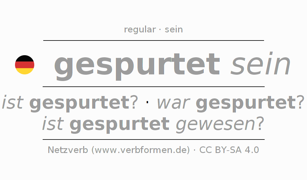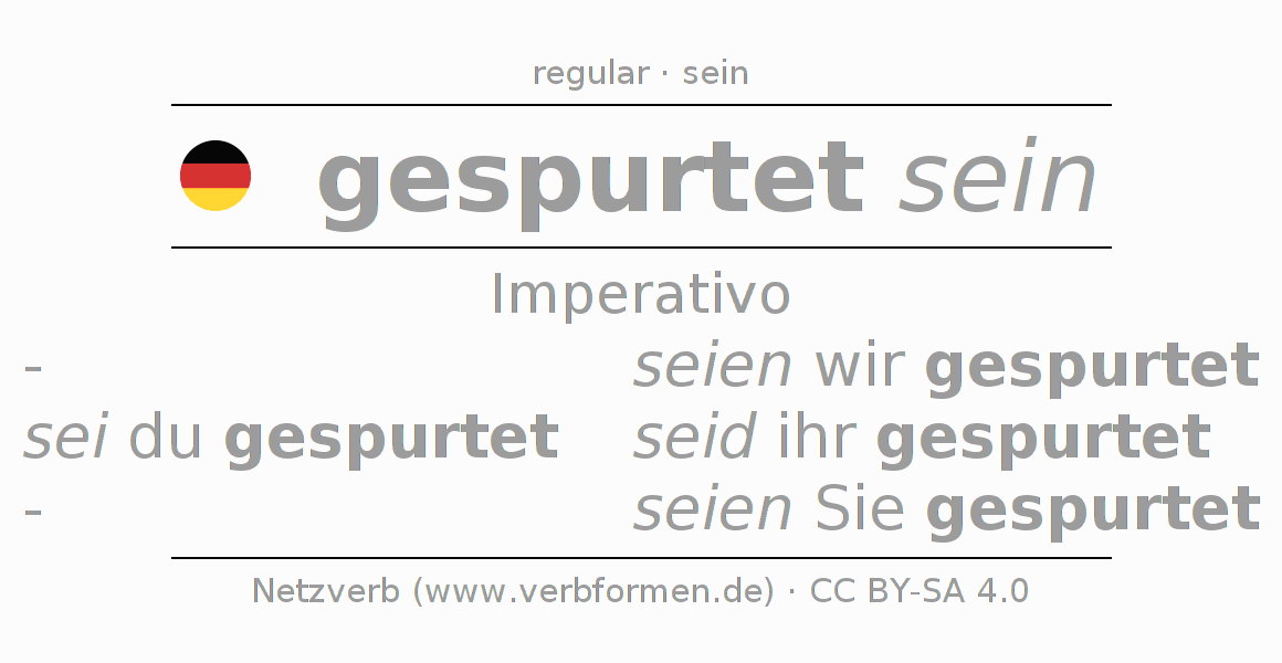 A conjugação do verbo spurten no Estado passivo Imperativo Presente Imperativo é: sei (du) gespurtet, seien wir gespurtet, seid (ihr) gespurtet, seien Sie gespurtet.A formação dessas formas segue determinadas regras gramaticais. Os requisitos para a conjugação do verbo como forma verbal simples no spurten do Imperativo. Comentários ☆