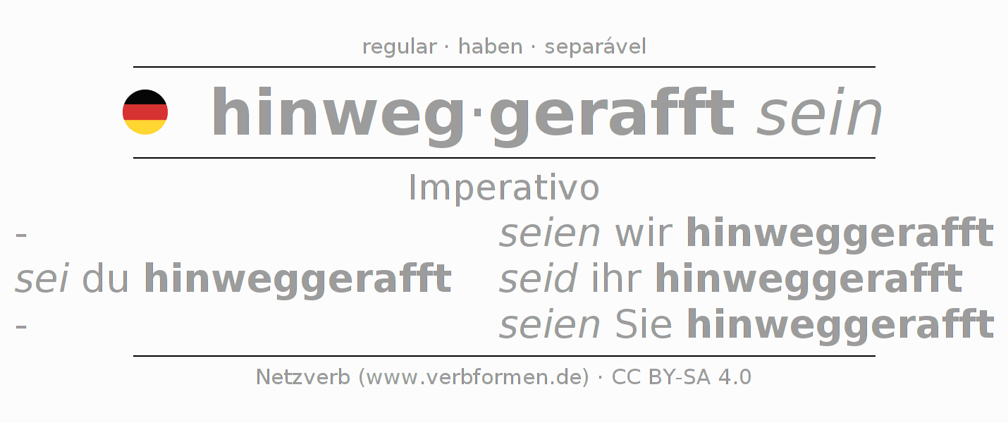 A conjugação do verbo hinwegraffen no Estado passivo Imperativo Presente Imperativo é: sei (du) hinweggerafft, seien wir hinweggerafft, seid (ihr) hinweggerafft, seien Sie hinweggerafft.A formação dessas formas segue determinadas regras gramaticais. Os requisitos para a conjugação do verbo como forma verbal simples no hinwegraffen do Imperativo. Comentários ☆