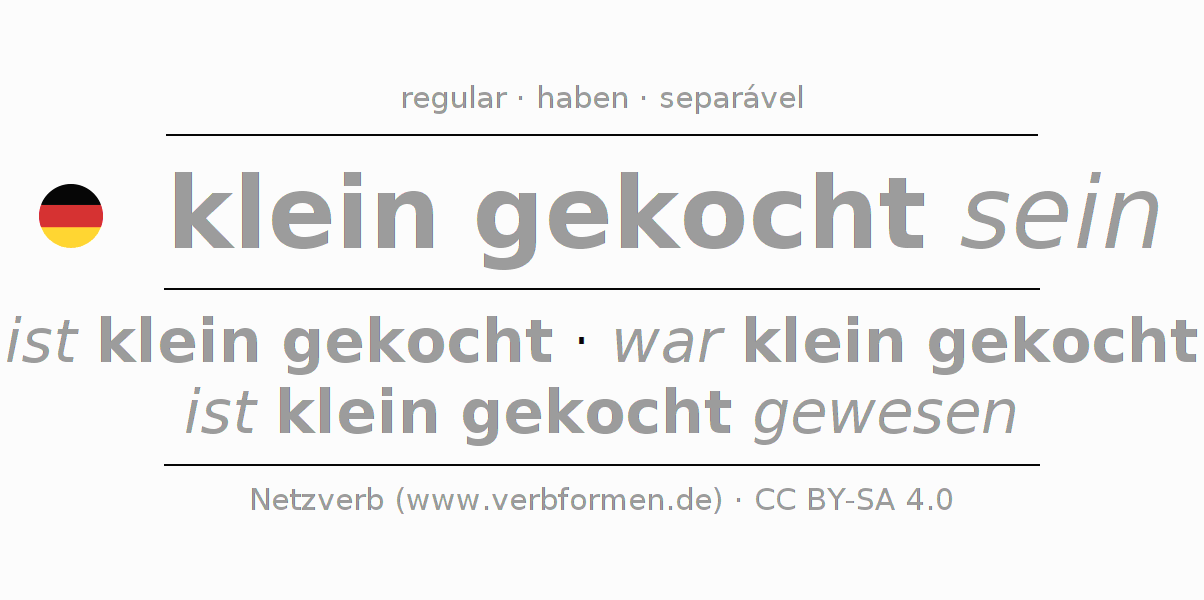 A conjugação do verbo kleinkochen no Estado passivo Imperativo Presente Imperativo é: sei (du) klein gekocht, seien wir klein gekocht, seid (ihr) klein gekocht, seien Sie klein gekocht.A formação dessas formas segue determinadas regras gramaticais. Os requisitos para a conjugação do verbo como forma verbal simples no kleinkochen do Imperativo. Comentários ☆