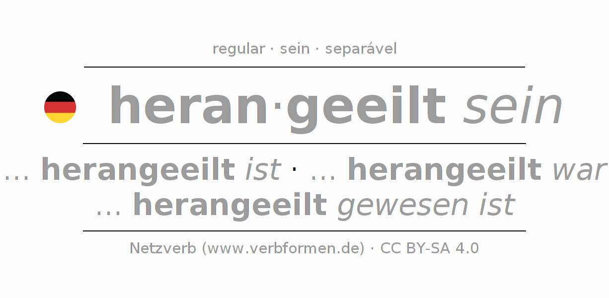 A conjugação do verbo heraneilen no Estado passivo Imperativo Presente Imperativo é: sei (du) herangeeilt, seien wir herangeeilt, seid (ihr) herangeeilt, seien Sie herangeeilt.A formação dessas formas segue determinadas regras gramaticais. Os requisitos para a conjugação do verbo como forma verbal simples no heraneilen do Imperativo. Comentários ☆