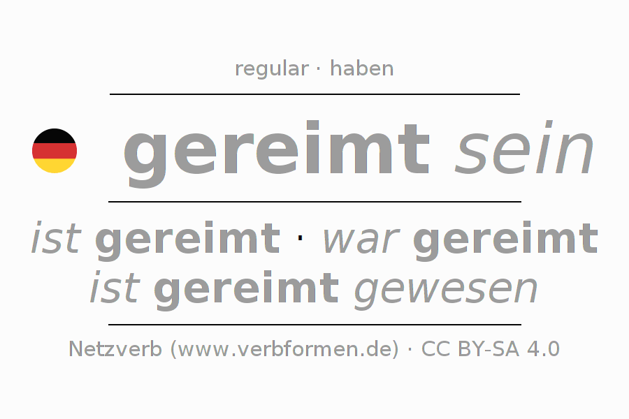 A conjugação do verbo reimen no Estado passivo Imperativo Presente Imperativo é: sei (du) gereimt, seien wir gereimt, seid (ihr) gereimt, seien Sie gereimt.A formação dessas formas segue determinadas regras gramaticais. Os requisitos para a conjugação do verbo como forma verbal simples no reimen do Imperativo. Comentários ☆