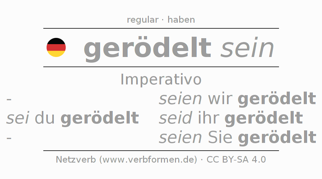 A conjugação do verbo rödeln no Estado passivo Imperativo Presente Imperativo é: sei (du) gerödelt, seien wir gerödelt, seid (ihr) gerödelt, seien Sie gerödelt.A formação dessas formas segue determinadas regras gramaticais. Os requisitos para a conjugação do verbo como forma verbal simples no rödeln do Imperativo. Comentários ☆