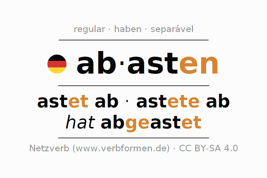 As formas de conjugação do verbo abasten (esforçar-se, lutar) no presente são: ich aste ab, du astest ab, er astet ab, wir asten ab, ihr astet ab, sie asten ab