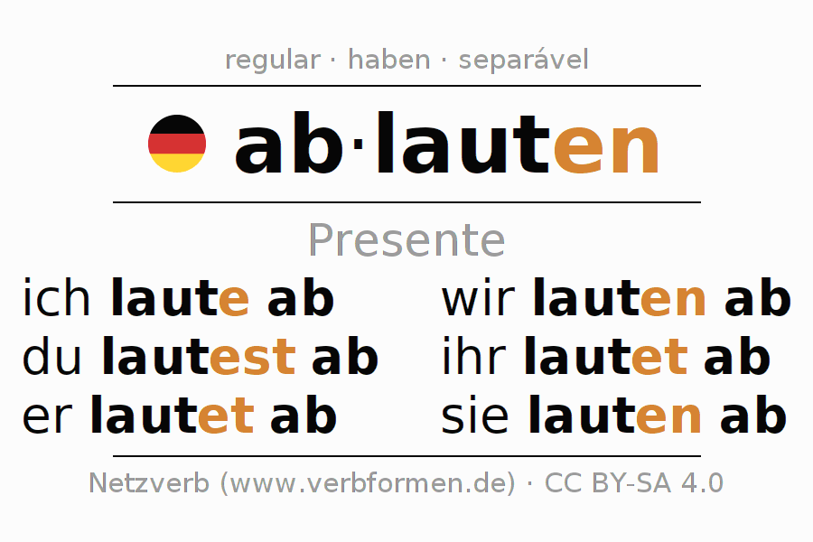 As formas de conjugação do verbo ablauten (ablaut, vocalização) no presente são: ich laute ab, du lautest ab, er lautet ab, wir lauten ab, ihr lautet ab, sie lauten ab