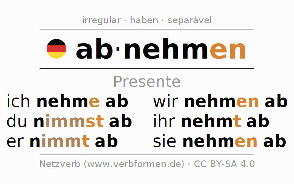 As formas de conjugação do verbo abnehmen (tirar, diminuir) no presente são: ich nehme ab, du nimmst ab, er nimmt ab, wir nehmen ab, ihr nehmt ab, sie nehmen ab