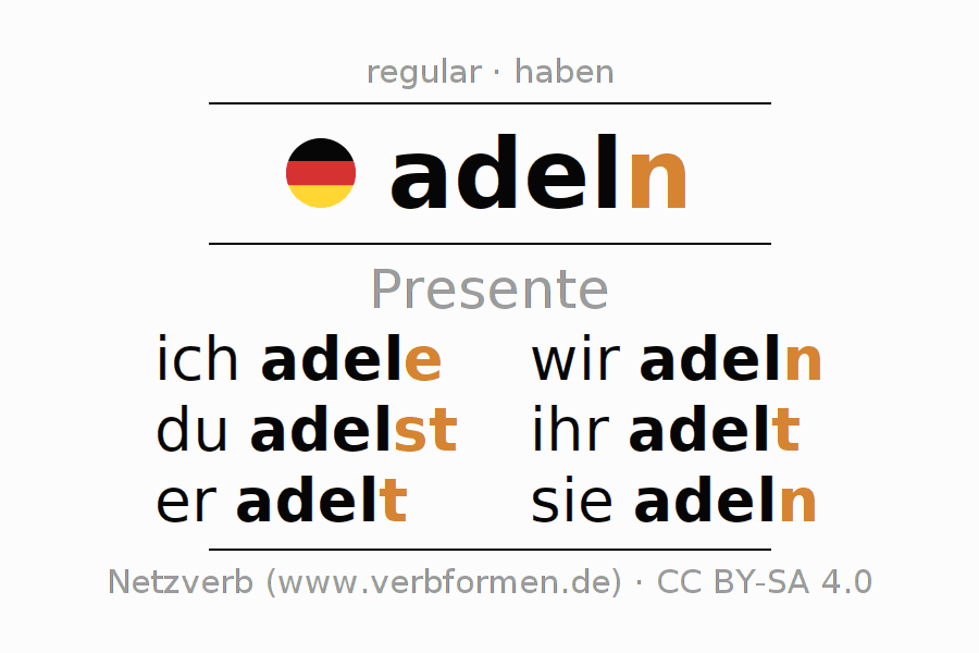 As formas de conjugação do verbo adeln (nobrecer, tornar nobre) no presente são: ich ad(e)le, du adelst, er adelt, wir adeln, ihr adelt, sie adeln