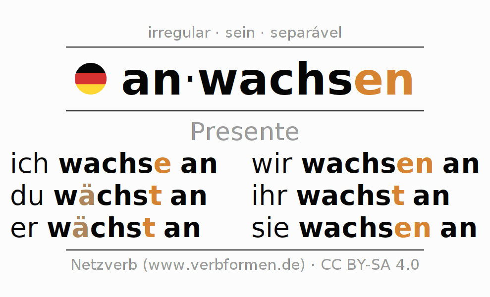 As formas de conjugação do verbo anwachsen (aumentar, crescer) no presente são: ich wachse an, du wächst an, er wächst an, wir wachsen an, ihr wachst an, sie wachsen an