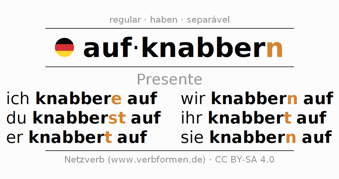 As formas de conjugação do verbo aufknabbern (mordiscar, petiscar) no presente são: ich knabb(e)re auf, du knabberst auf, er knabbert auf, wir knabbern auf, ihr knabbert auf, sie knabbern auf