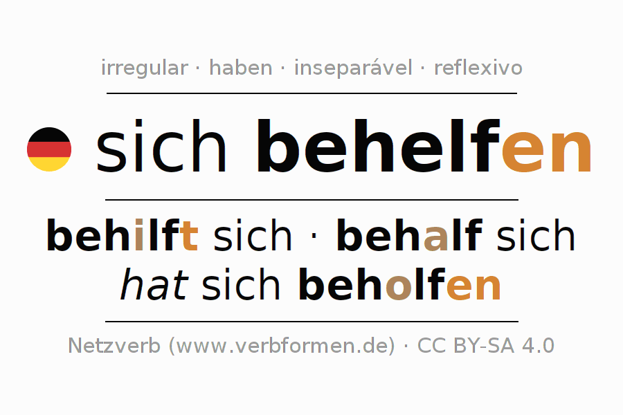 As formas de conjugação do verbo sich behelfen (ajudar-se, arranjar-se) no presente são: ich behelfe mir/mich, du behilfst dir/dich, er behilft sich, wir behelfen uns, ihr behelft euch, sie behelfen sich. Para este propósito as terminações -e, -st, -t, -en, -t, -en são anexadas ao radical helf.Como verbo irregular na 2ª e na 3ª pessoa é utilizado o radical modificado do presente hilf. A construção destas formas correspondem às regras gramaticais para a conjugação dos verbos no presente. Comentários