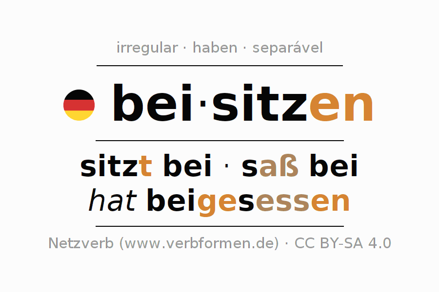 As formas de conjugação do verbo beisitzen (juiz, membro) no presente são: ich sitze bei, du sitzt bei, er sitzt bei, wir sitzen bei, ihr sitzt bei, sie sitzen bei