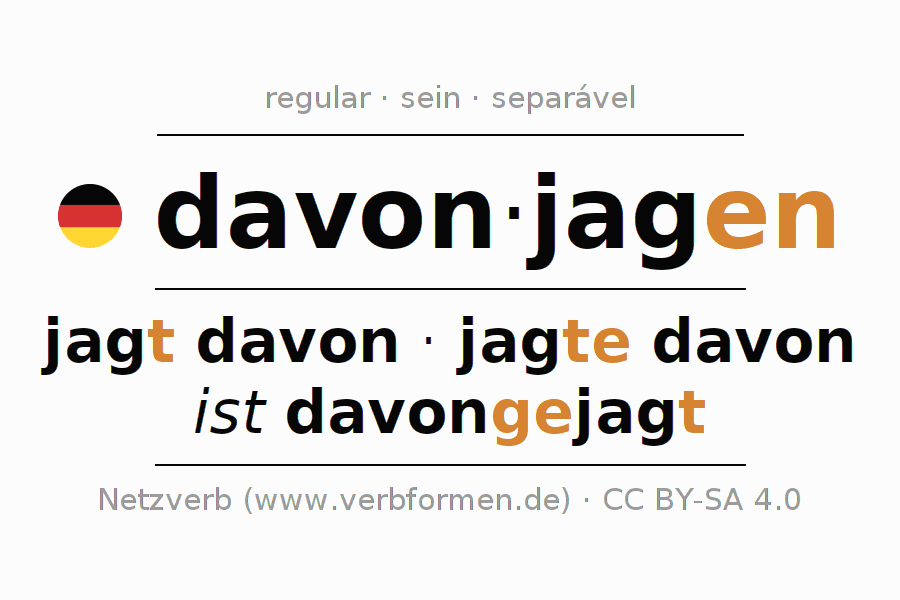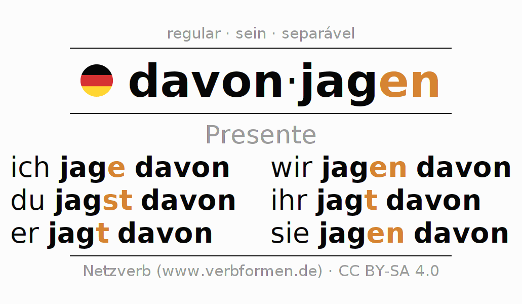 As formas de conjugação do verbo davonjagen (afastar-se rapidamente, fugir) no presente são: ich jage davon, du jagst davon, er jagt davon, wir jagen davon, ihr jagt davon, sie jagen davon