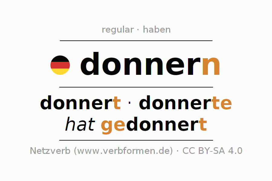 As formas de conjugação do verbo donnern (trovejar, estrondar) no presente são: ich donn(e)re, du donnerst, es donnert, wir donnern, ihr donnert, sie donnern