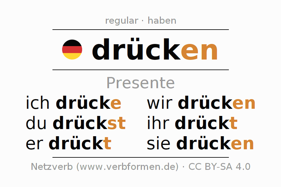 As formas de conjugação do verbo drücken (pressionar, abraçar) no presente são: ich drücke, du drückst, er drückt, wir drücken, ihr drückt, sie drücken