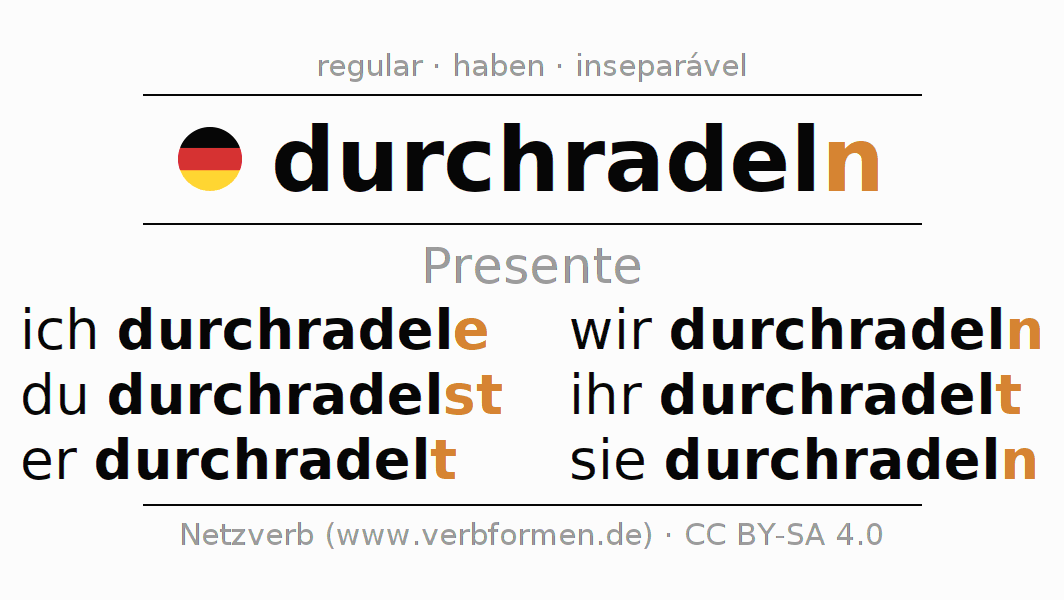 O verbo durchradeln (hat) é totalmente conjugado em todas as pessoas e números no Presente Indicativo