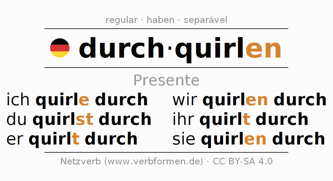 As formas de conjugação do verbo durchquirlen (bater, misturar) no presente são: ich quirle durch, du quirlst durch, er quirlt durch, wir quirlen durch, ihr quirlt durch, sie quirlen durch