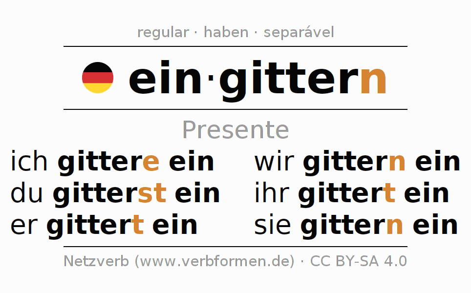 As formas de conjugação do verbo eingittern (cercar, envolver com grade) no presente são: ich gitt(e)re ein, du gitterst ein, er gittert ein, wir gittern ein, ihr gittert ein, sie gittern ein