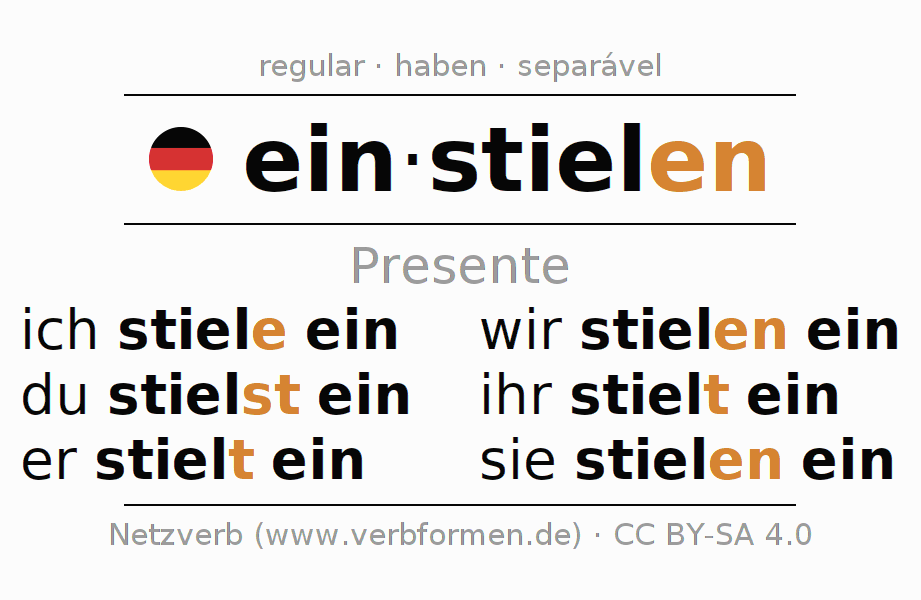 As formas de conjugação do verbo einstielen (arranjar, organizar) no presente são: ich stiele ein, du stielst ein, er stielt ein, wir stielen ein, ihr stielt ein, sie stielen ein