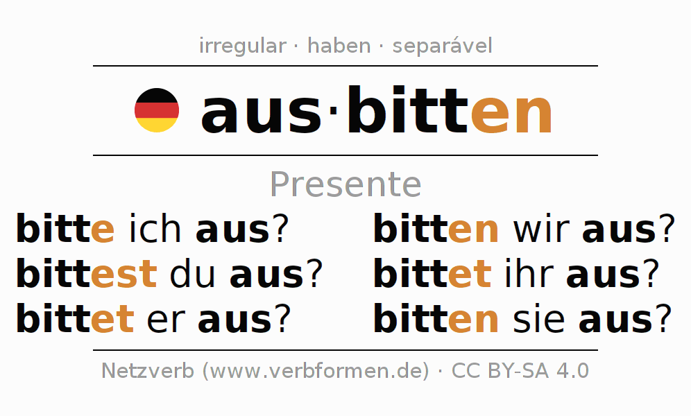 A conjugação do verbo ausbitten no Ativo Presente Indicativo Presente é: bitte ich aus?, bittest du aus?, bittet er aus?, bitten wir aus?, bittet ihr aus?, bitten sie aus?.A formação dessas formas segue determinadas regras gramaticais. Os requisitos para a conjugação do verbo como forma verbal simples no ausbitten do Presente. Comentários ☆