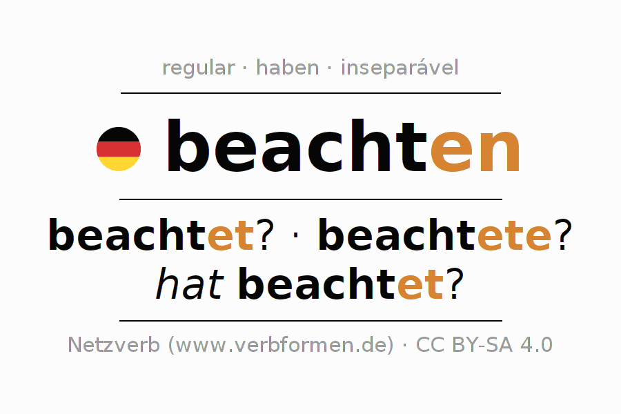 A conjugação do verbo beachten no Ativo Presente Indicativo Presente é: beachte ich?, beachtest du?, beachtet er?, beachten wir?, beachtet ihr?, beachten sie?.A formação dessas formas segue determinadas regras gramaticais. Os requisitos para a conjugação do verbo como forma verbal simples no beachten do Presente. Comentários ☆