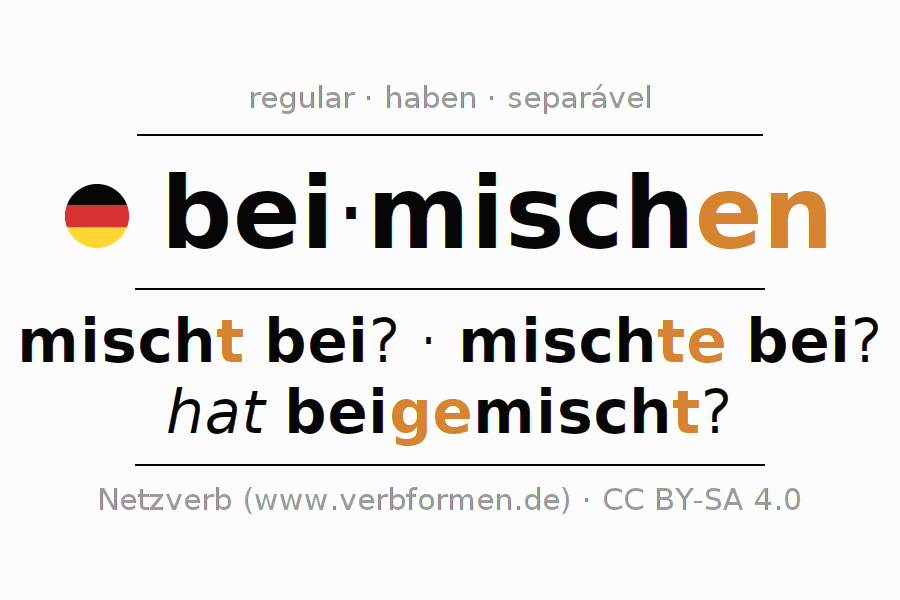 A conjugação do verbo beimischen no Ativo Presente Indicativo Presente é: mische ich bei?, mischst du bei?, mischt er bei?, mischen wir bei?, mischt ihr bei?, mischen sie bei?.A formação dessas formas segue determinadas regras gramaticais. Os requisitos para a conjugação do verbo como forma verbal simples no beimischen do Presente. Comentários ☆