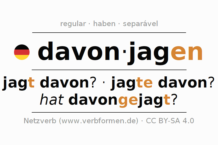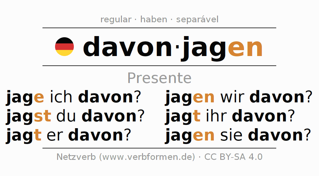 A conjugação do verbo davonjagen no Ativo Presente Indicativo Presente é: jage ich davon?, jagst du davon?, jagt er davon?, jagen wir davon?, jagt ihr davon?, jagen sie davon?.A formação dessas formas segue determinadas regras gramaticais. Os requisitos para a conjugação do verbo como forma verbal simples no davonjagen do Presente. Comentários ☆