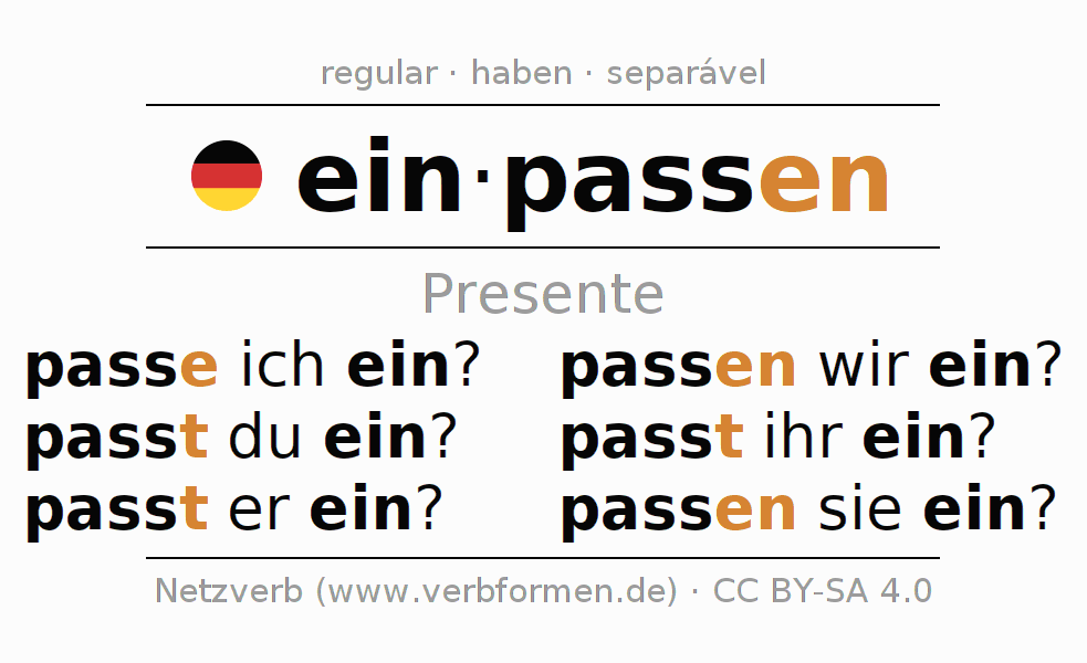A conjugação do verbo einpassen no Ativo Presente Indicativo Presente é: passe ich ein?, passt du ein?, passt er ein?, passen wir ein?, passt ihr ein?, passen sie ein?.A formação dessas formas segue determinadas regras gramaticais. Os requisitos para a conjugação do verbo como forma verbal simples no einpassen do Presente. Comentários ☆