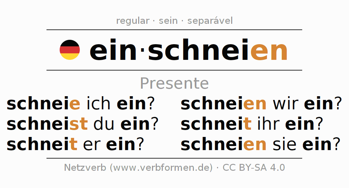 A conjugação do verbo einschneien no Ativo Presente Indicativo Presente é: schneie ich ein?, schneist du ein?, schneit er ein?, schneien wir ein?, schneit ihr ein?, schneien sie ein?.A formação dessas formas segue determinadas regras gramaticais. Os requisitos para a conjugação do verbo como forma verbal simples no einschneien do Presente. Comentários ☆