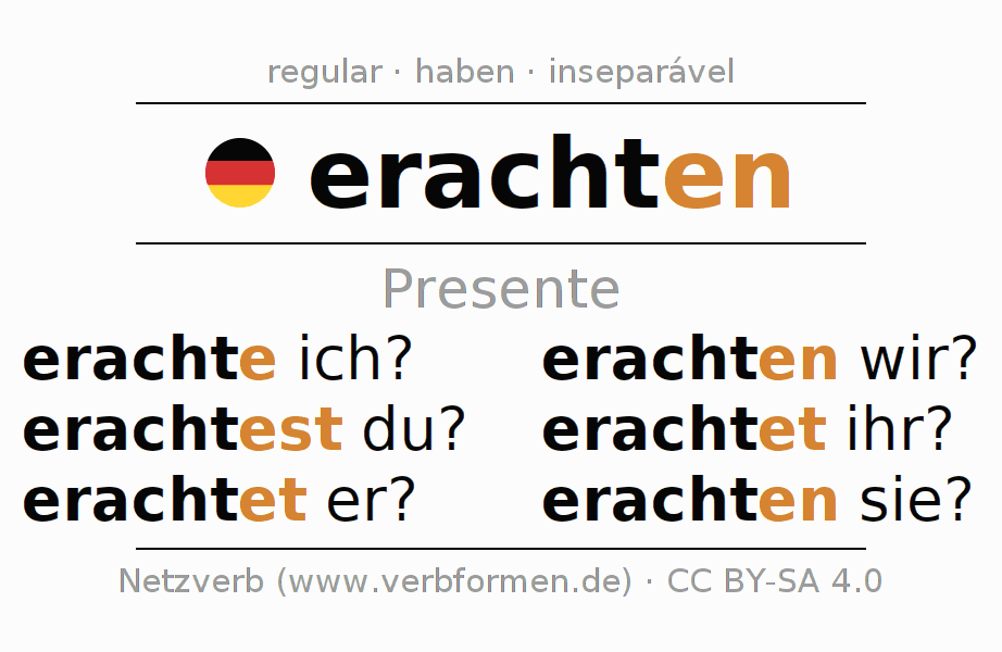 A conjugação do verbo erachten no Ativo Presente Indicativo Presente é: erachte ich?, erachtest du?, erachtet er?, erachten wir?, erachtet ihr?, erachten sie?.A formação dessas formas segue determinadas regras gramaticais. Os requisitos para a conjugação do verbo como forma verbal simples no erachten do Presente. Comentários ☆