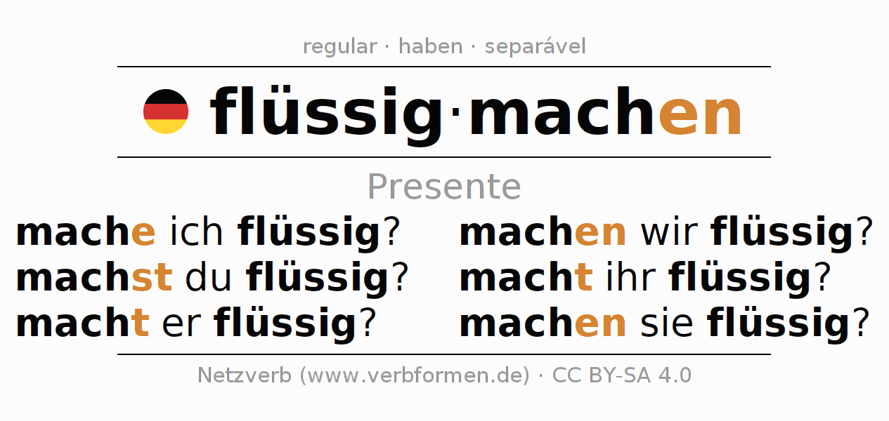 O verbo flüssigmachen é totalmente conjugado em todas as pessoas e números no Presente Indicativo