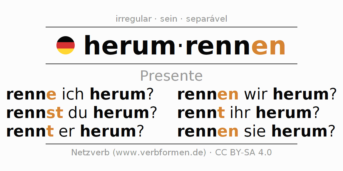 A conjugação do verbo herumrennen no Ativo Presente Indicativo Presente é: renne ich herum?, rennst du herum?, rennt er herum?, rennen wir herum?, rennt ihr herum?, rennen sie herum?.A formação dessas formas segue determinadas regras gramaticais. Os requisitos para a conjugação do verbo como forma verbal simples no herumrennen do Presente. Comentários ☆