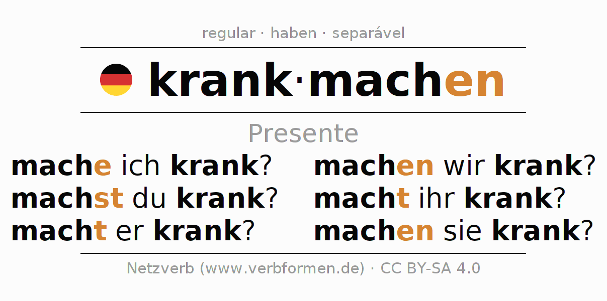A conjugação do verbo krankmachen no Ativo Presente Indicativo Presente é: mache ich krank?, machst du krank?, macht er krank?, machen wir krank?, macht ihr krank?, machen sie krank?.A formação dessas formas segue determinadas regras gramaticais. Os requisitos para a conjugação do verbo como forma verbal simples no krankmachen do Presente. Comentários ☆