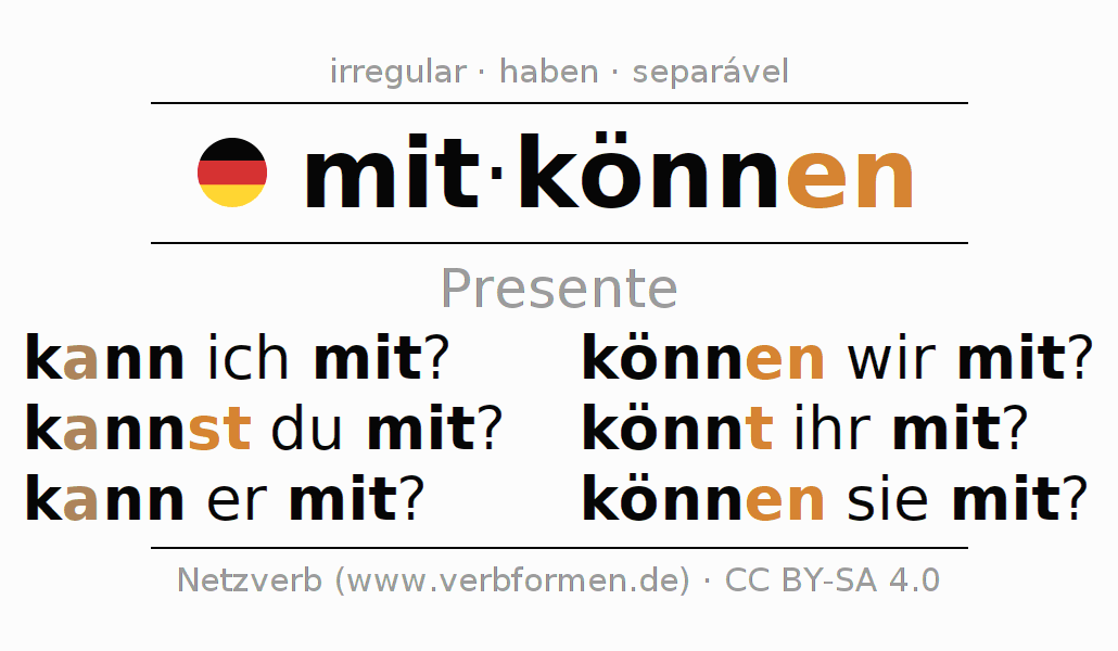 A conjugação do verbo mitkönnen no Ativo Presente Indicativo Presente é: kann ich mit?, kannst du mit?, kann er mit?, können wir mit?, könnt ihr mit?, können sie mit?.A formação dessas formas segue determinadas regras gramaticais. Os requisitos para a conjugação do verbo como forma verbal simples no mitkönnen do Presente. Comentários ☆