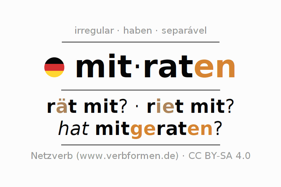 A conjugação do verbo mitraten no Ativo Presente Indicativo Presente é: rate ich mit?, rätst du mit?, rät er mit?, raten wir mit?, ratet ihr mit?, raten sie mit?.A formação dessas formas segue determinadas regras gramaticais. Os requisitos para a conjugação do verbo como forma verbal simples no mitraten do Presente. Comentários ☆