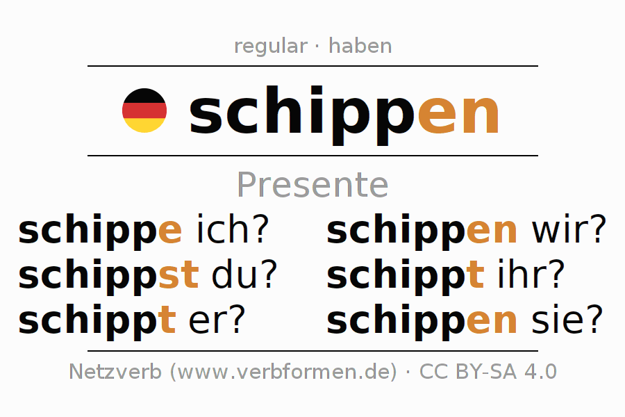 A conjugação do verbo schippen no Ativo Presente Indicativo Presente é: schippe ich?, schippst du?, schippt er?, schippen wir?, schippt ihr?, schippen sie?.A formação dessas formas segue determinadas regras gramaticais. Os requisitos para a conjugação do verbo como forma verbal simples no schippen do Presente. Comentários ☆