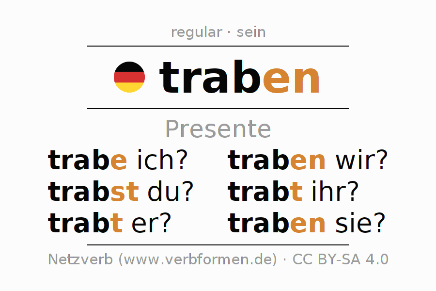 A conjugação do verbo traben no Ativo Presente Indicativo Presente é: trabe ich?, trabst du?, trabt er?, traben wir?, trabt ihr?, traben sie?.A formação dessas formas segue determinadas regras gramaticais. Os requisitos para a conjugação do verbo como forma verbal simples no traben do Presente. Comentários ☆