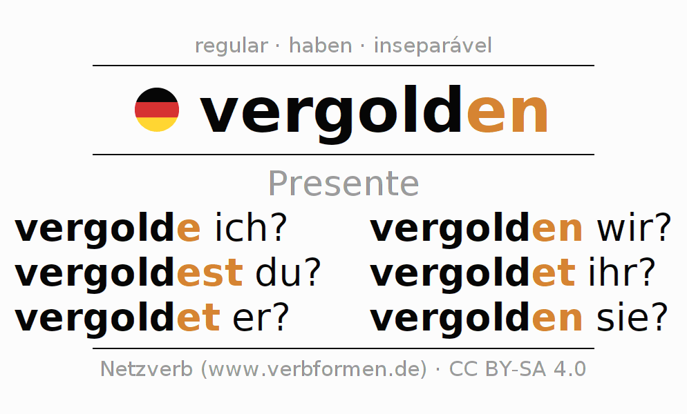 A conjugação do verbo vergolden no Ativo Presente Indicativo Presente é: vergolde ich?, vergoldest du?, vergoldet er?, vergolden wir?, vergoldet ihr?, vergolden sie?.A formação dessas formas segue determinadas regras gramaticais. Os requisitos para a conjugação do verbo como forma verbal simples no vergolden do Presente. Comentários ☆