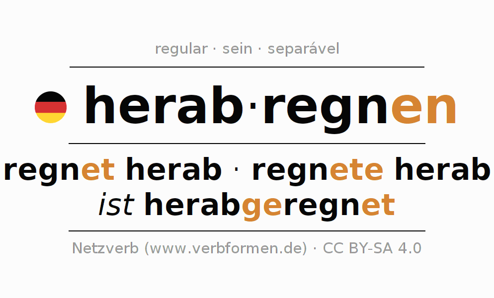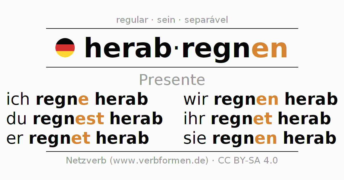 As formas de conjugação do verbo herabregnen (cair, descer) no presente são: ich regne herab, du regnest herab, er regnet herab, wir regnen herab, ihr regnet herab, sie regnen herab