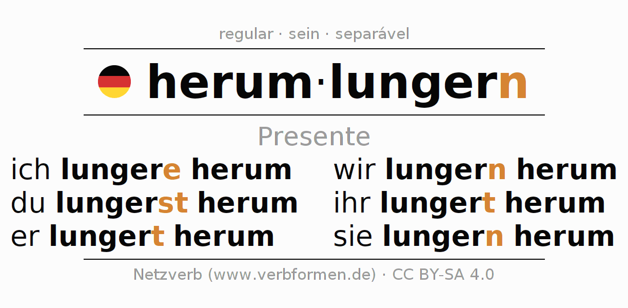 As formas de conjugação do verbo herumlungern (perambular, vadiar) no presente são: ich lung(e)re herum, du lungerst herum, er lungert herum, wir lungern herum, ihr lungert herum, sie lungern herum