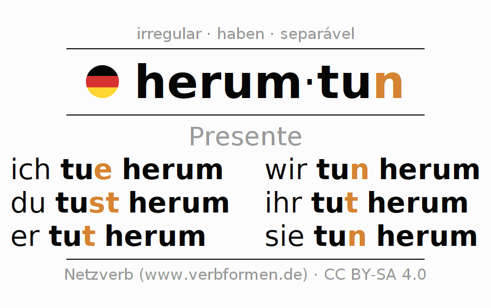 As formas de conjugação do verbo herumtun (causar transtornos, fazer esforço desnecessário) no presente são: ich tue herum, du tust herum, er tut herum, wir tun herum, ihr tut herum, sie tun herum